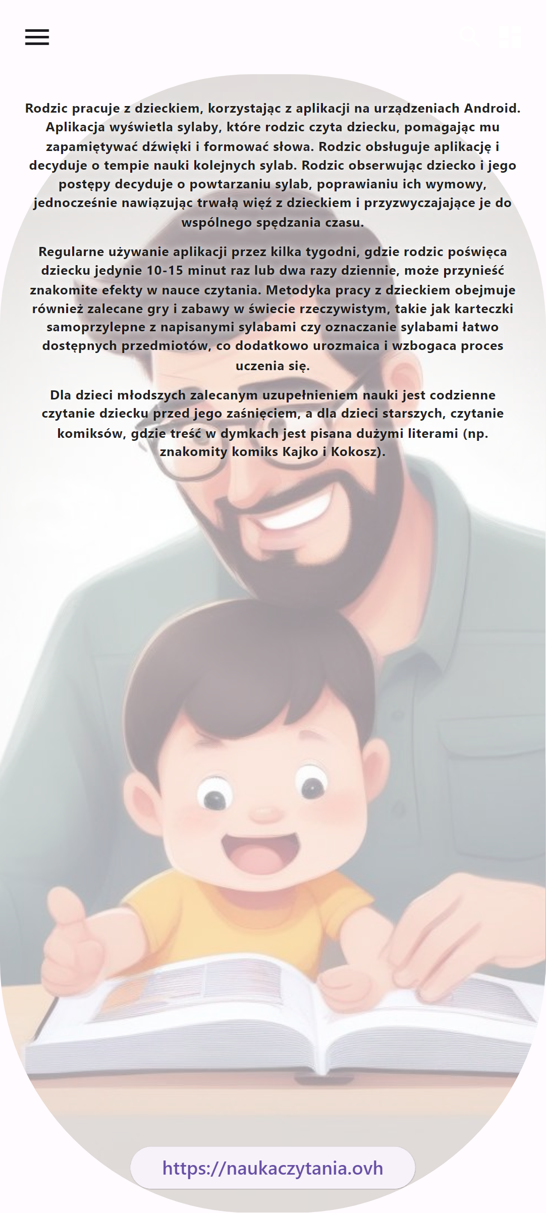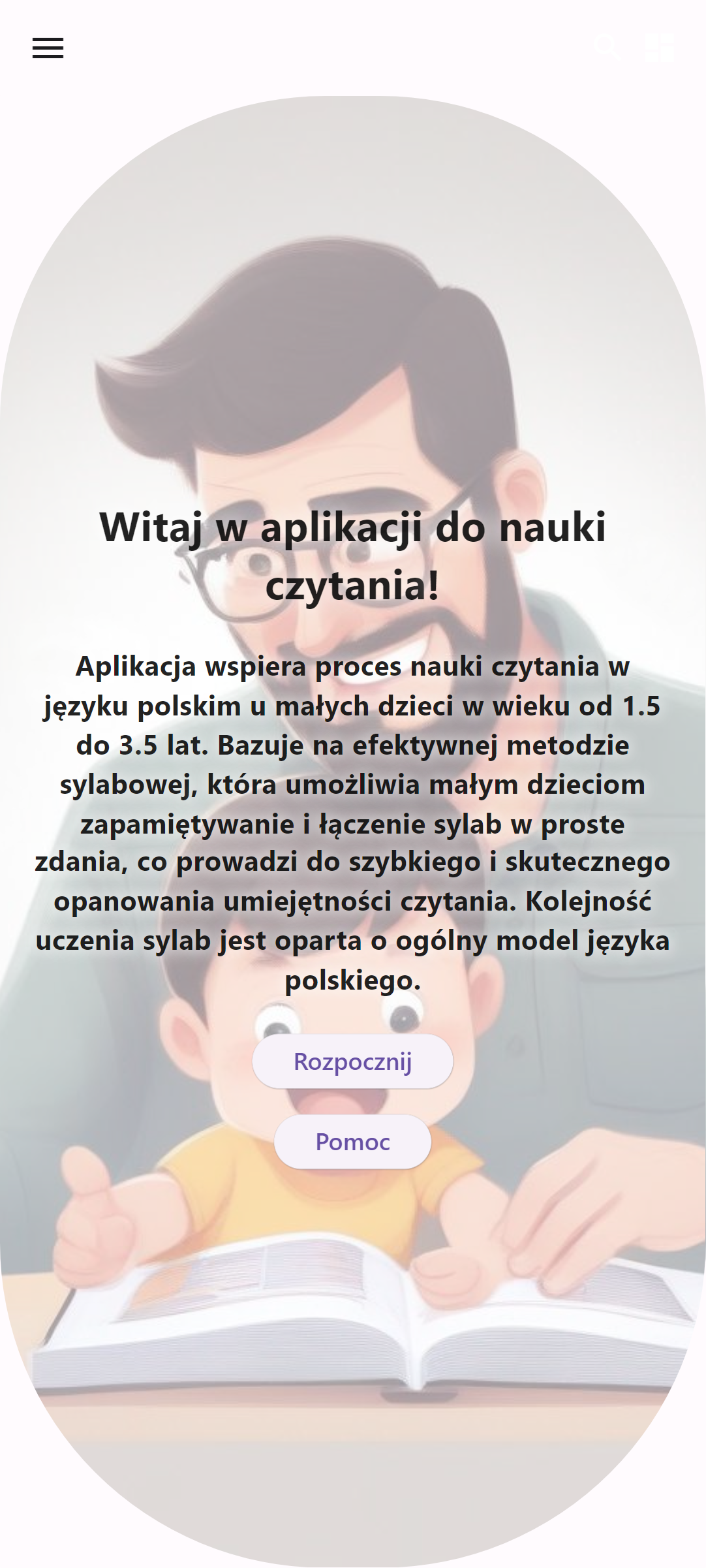 Aplikacja do nauki czytania jest narzędziem wspierającym proces nauki czytania w języku polskim u małych dzieci w wieku od 1.5 do 3.5 lat. Bazuje ona na efektywnej metodzie sylabowej, która umożliwia małym dzieciom zapamiętywanie i łączenie sylab w proste zdania, co prowadzi do szybkiego i skutecznego opanowania umiejętności czytania. Kolejność uczenia sylab jest oparta o ogólny model języka polskiego.